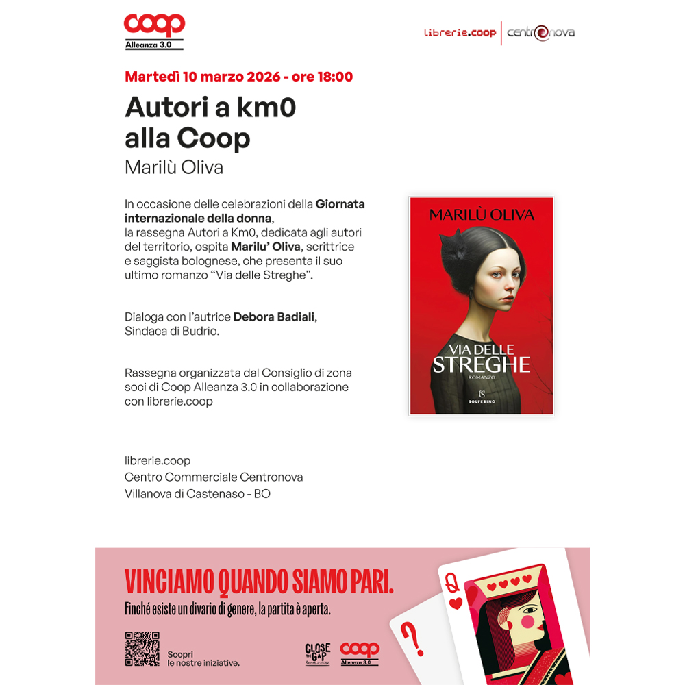 In occasione delle celebrazioni della Giornata internazionale della donna, la rassegna Autori a Km0, dedicata agli autori del territorio, ospita Marilu’ Oliva, scrittrice e saggista bolognese, che presenta il suo ultimo romanzo “Via delle Streghe”.
