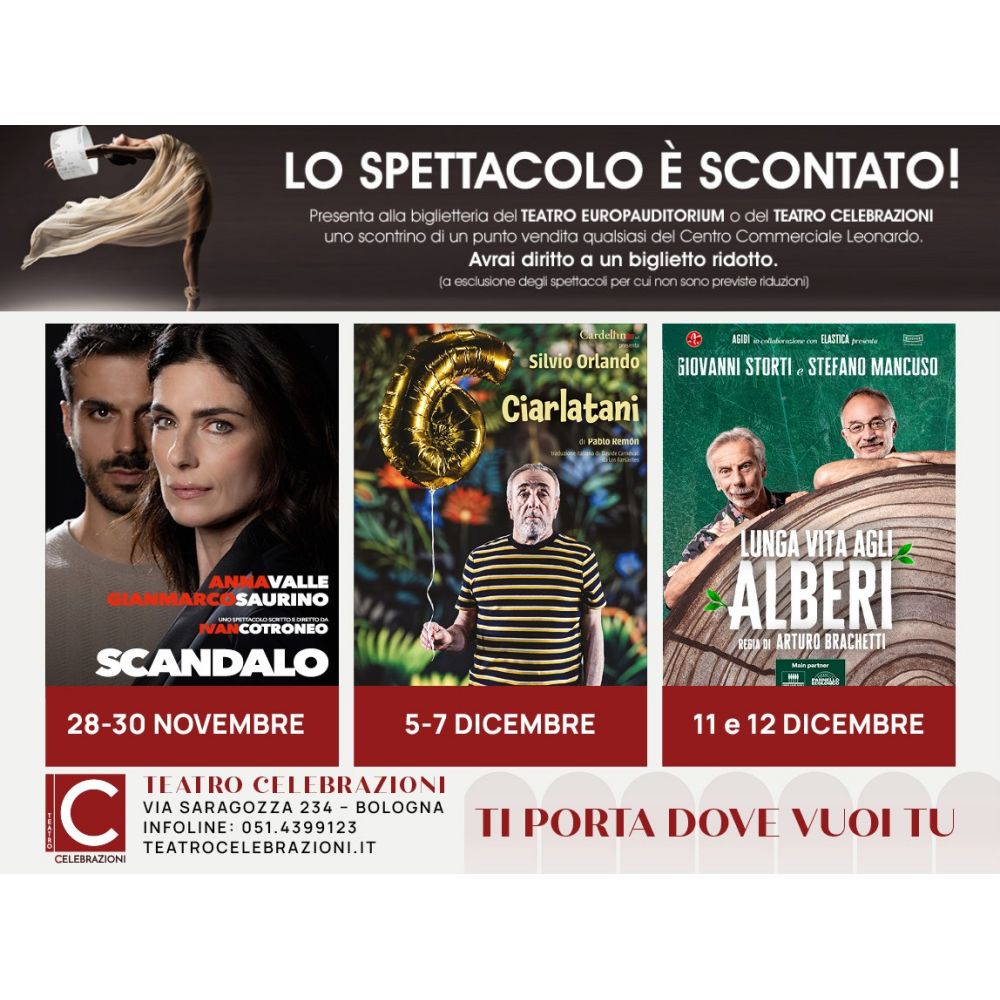 Presenta alla biglietteria del TEATRO EUROPAUDITORIUM o del TEATRO CELEBRAZIONI uno scontrino di un punto vendita qualsiasi del Centro Commerciale Leonardo.