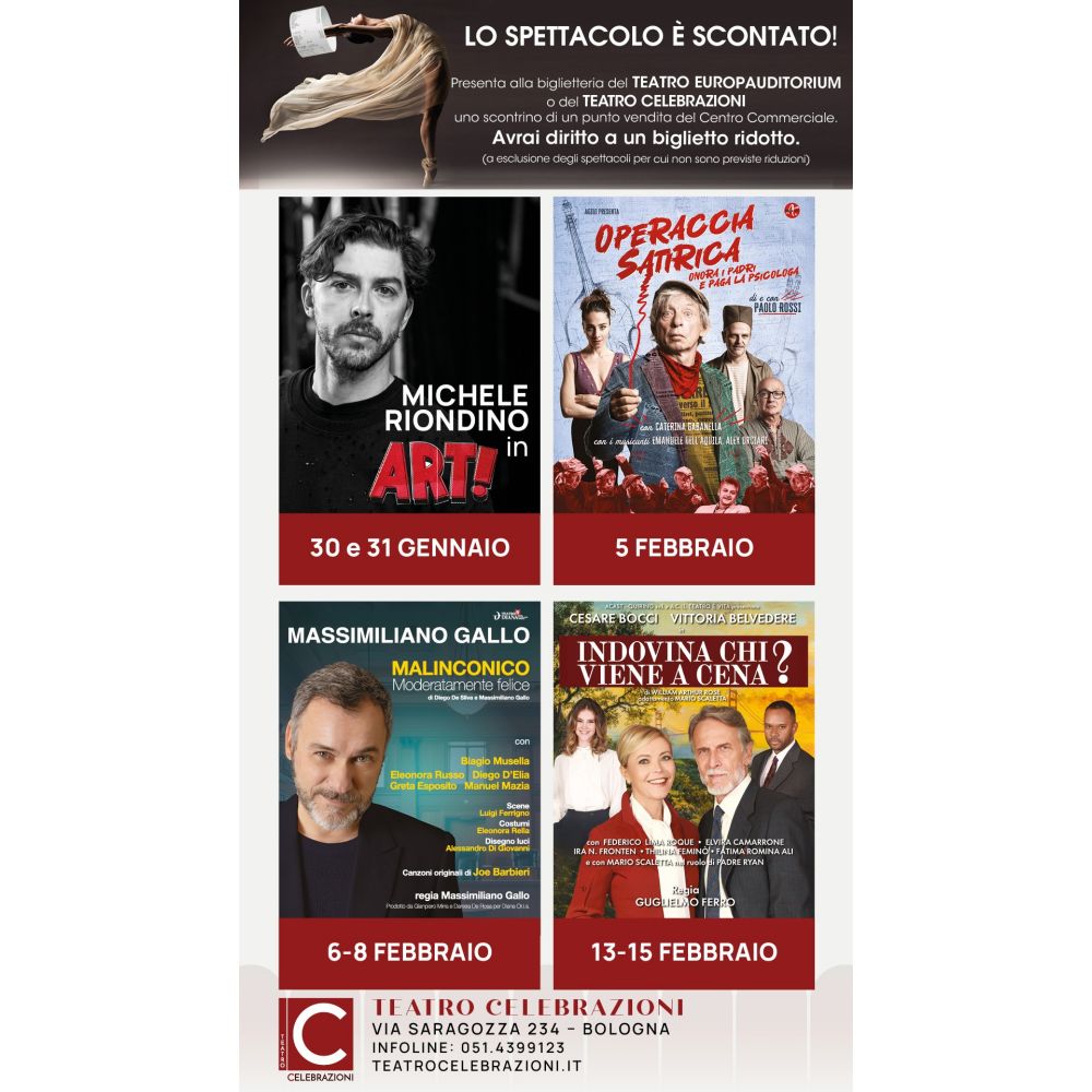 Presenta alla biglietteria del TEATRO EUROPAUDIOTRIUM o del TEATRO CELEBRAZIONI uno scontrino di un punto vendita del Centro Commerciale.