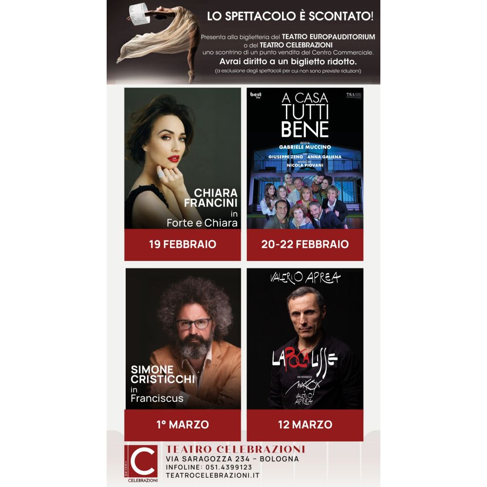 Presenta alla biglietteria del TEATRO EUROPAUDIOTRIUM o del TEATRO CELEBRAZIONI uno scontrino di un punto vendita del Centro Commerciale.