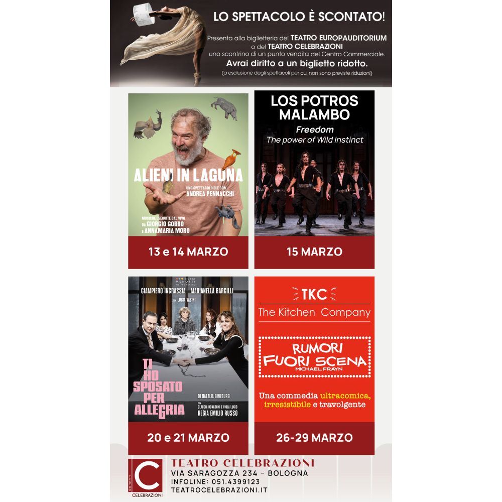 Presenta alla biglietteria del TEATRO EUROPAUDIOTRIUM o del TEATRO CELEBRAZIONI uno scontrino di un punto vendita del Centro Commerciale.